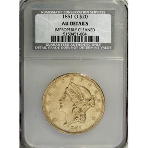 <B>1851-O $20 --Improperly Cleaned--NCS. AU Details.</B></I> Undoubtedly cleaned in the past, with bright green-gold surfaces. Both sides are hairlines and abraded, with evidence of minor polishing.<BR><BR><B>Coin Engraver:</B> James B. Longacre<BR><BR><b>Shipping:</b> Coins & Currency (<a target="_blank" href="http://www.heritageauctions.com/common/shipping.php">view shipping information</a>)