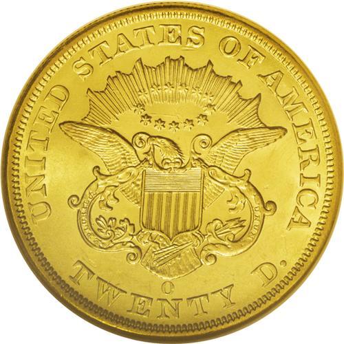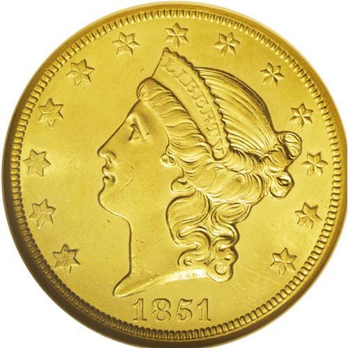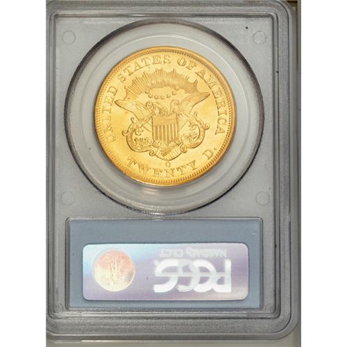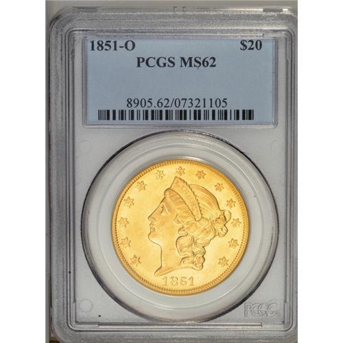 <B>1851-O<$20> MS62 NGC.</B></I> The 1851-O is one of the more available issues among the popular New Orleans Mint double eagles, and can be obtained without much difficulty up to and including to the lower threshold of AU. Above that level, the population thins out rapidly until Mint State survivors can be counted on one's fingers. The presently offered example is certainly one of the finest from this tiny group of Uncirculated '51-O twenties. The semi-reflective surfaces display incredible sharpness throughout and are richly colored in green-gold and yellow-gold hues. Abrasions are really quite minimal for a coin below the Select level, but a few trivial milling marks on the lower obverse stand in the way of a higher grade. Census: 13 in 62, 1 finer (7/06).<BR><I>From The New York Eye Appeal Collection.</B></I>