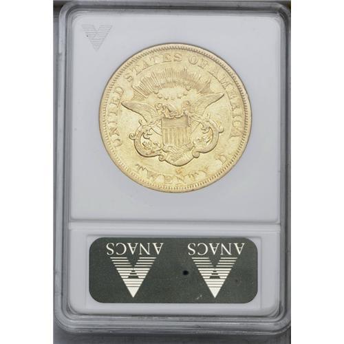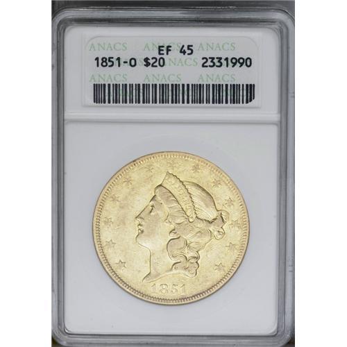 <B>1851-O<$20> XF45 ANACS.</B></I> Sharply struck with attenuated obverse stars, as struck due to excessive die polish. The surfaces are lightly abraded, but have much better eye appeal than most circulated double eagles. The mint luster is especially extensive on the reverse, and shows a prooflike finish in the most protected areas.