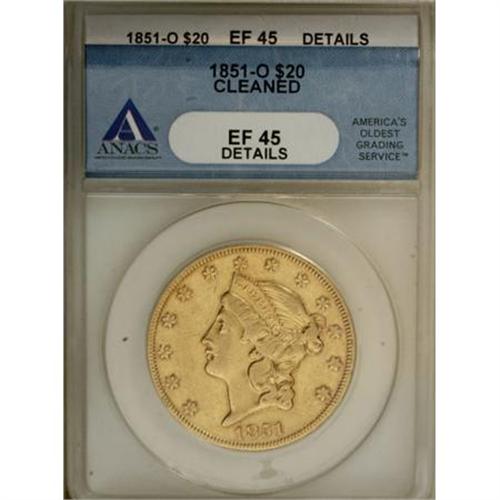 <B>1851-O $20 --Cleaned--ANACS. XF45 Details.</B></I> All New Orleans double eagles are at least scarce, and several issues are very rare. The 1851-O falls into the former category, but is in demand as a representative of our Southernmost mint. This lightly cleaned example has ample glimpses of rose-tinted luster. The obverse field is typically abraded, while the portrait and reverse are smooth.<BR><BR><B>Coin Engraver:</B> James B. Longacre<BR><BR><b>Shipping:</b> Coins & Currency (<a target="_blank" href="http://www.heritageauctions.com/common/shipping.php">view shipping information</a>)