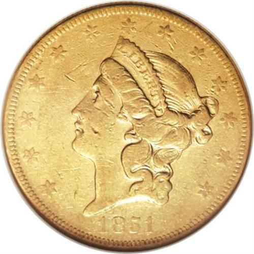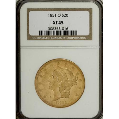 <B>1851-O $20 XF45 NGC.</B></I> Light, even wear for this second-year New Orleans date, with richly toned, moderately abraded surfaces. Lovely reddish-gold and green toning adorns each side, along with faint glimmers of mint luster. The coin appears to have been struck from a weakly impressed obverse die as the definition is uniformly light over that side, but the reverse is strongly defined.<BR><BR><B>Coin Engraver:</B> James B. Longacre<BR><BR><b>Shipping:</b> Coins & Currency (<a target="_blank" href="http://www.heritageauctions.com/common/shipping.php">view shipping information</a>\)