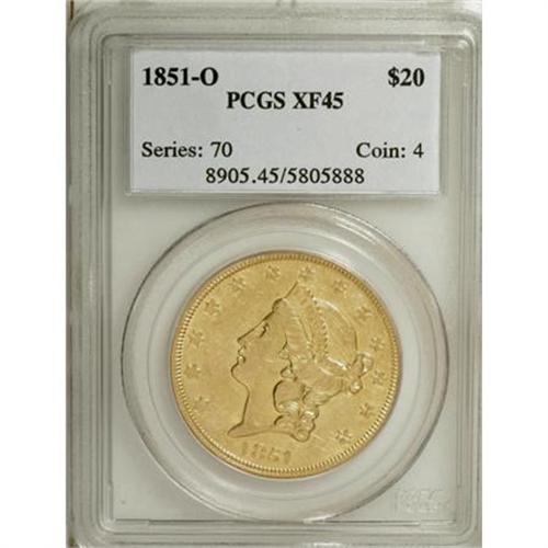 <B>1851-O $20 XF45 PCGS.</B></I> About half of the original mint luster clings to the surfaces of this appealing Choice XF piece. The strike is boldly executed for this second-year O-mint issue of the series, and only light field chatter consistent with the grade is visible. There are no individually relevant marks. <BR><BR><B>Coin Engraver:</B> James B. Longacre<BR><BR><b>Shipping:</b> Coins & Currency (<a target="_blank" href="http://www.heritageauctions.com/common/shipping.php">view shipping information</a>)