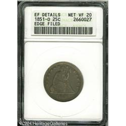 1851-O 25C --Edge Filed--ANACS. XF Details, Net VF20. <B>1851-O 25C --Edge Filed--ANACS. XF Details, Net VF20.</B></I> A nicely defined dove-gray representative of this difficult low mintage issue. The edge is damaged near 9 o'clock and the rim is cut near 10 o'clock. <BR><BR><B>Important notice:</B> Heritage usually auctions material at the rate of 200-250 lots per hour. On some occasions eBay Live bid software or the Internet may not be able to keep up with the pace of the auction. We recommend placing a realistic absentee bid now as insurance to avoid disappointment. Occasionally the auctioneer may eliminate or reject an eBay Live bid, and the auctioneer may also reopen a lot after the close of the eBay live bidding (usually because we missed an audience bid), and may reject your bid even if it shows you as the winning bidder. By bidding via eBay Live, you agree that Heritage may award the lot to another bidder at its sole discretion under the circumstances described above or any other reasonable circumstances. Since eBay bids are not shown to us until we open the lot on the floor, we treat those bids just like floor bids. In most cases the floor responds before the eBay bid is presented to us, due to Internet lag time, so for consistency we have made it a policy that floor bids are always considered first over tie eBay live bids. Also please note that all Heritage lots purchased through eBay Live carry a 20% Buyer's Premium. Please make sure you read the Terms and Conditions before you bid. This lot is being auctioned in conjunction with a live floor auction by Heritage Galleries & Auctioneers. All final auction and invoice information will be supplied by Heritage Galleries & Auctioneers, and all other information should be considered preliminary. Lot:5881