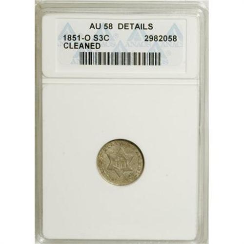 <B>1851-O 3CS --Cleaned--ANACS. AU58 Details.</B></I> NGC Census: (20/289). PCGS Population (29/269). Mintage: 720,000. Numismedia Wsl. Price for NGC/PCGS coin in AU58: $225. (#3665)<BR><BR><b>Shipping:</b> Coins & Currency (<a target="_blank" href="http://www.heritageauctions.com/common/shipping.php">view shipping information</a>)