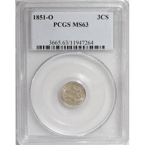 <B>1851-O 3CS MS63 PCGS.</B></I> A luminous and richly toned Select example of this ever-popular O-mint trime issue, well struck overall with pleasing patina. Silver-gray and green-gold surfaces show small dots of deeper sage toning.<BR><BR><B>Coin Engraver:</B> James B. Longacre<BR><BR><b>Shipping:</b> Coins & Currency (<a target="_blank" href="http://www.heritageauctions.com/common/shipping.php">view shipping information</a>)