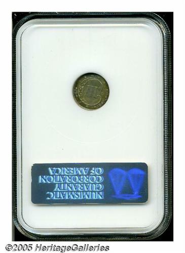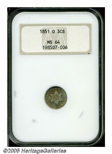 <B>1851-O<3CS> MS64 NGC.</B></I> A coin of enduring popularity with collectors, the 1851-O is the only mintmarked Three Cent Silver. The surfaces of this extraordinary coin have dappled, multicolored rose, gold, gold-brown, lilac, and lime-green blue patination in a very light manner. Beneath the light layerings of color are glimmers of sparkling mint luster that further enhance the rich tonal qualities. Adequately struck, and no significant contact marks. Population: 84 in 64, 59 finer (4/05).<BR><I>From The Clifford Columbus Collection.</B></I>