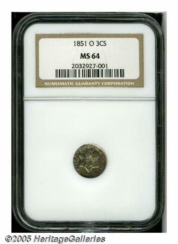 <B>1851-O<3CS> MS64 NGC.</B></I> A virtual Gem of this popular branch mint "trime." The surfaces are toned a mottled reddish-gray and have red and green overtones about the stars and lettering. Population: 84 in 64, 59 finer (4/05).