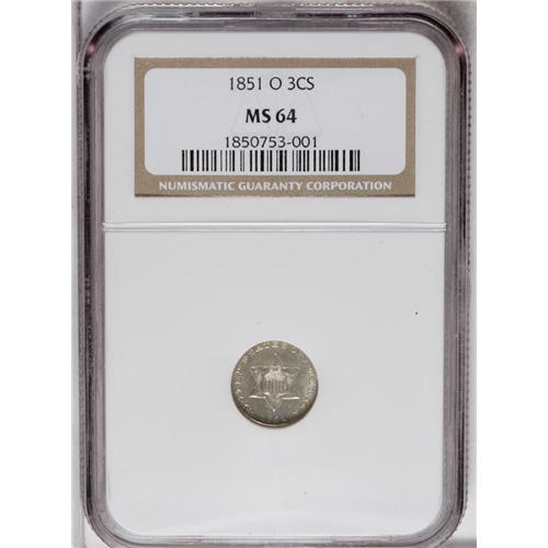 <B>1851-O<3CS> MS64 NGC.</B></I> This is a wonderful example of the only mintmarked issue in this series. Fully lustrous and scarce in this state of preservation. Census: 91 in 64, 63 finer (8/06).