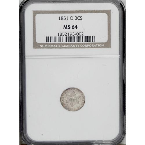 1851-O 3CS MS64 NGC. Typically struck with subtly lust