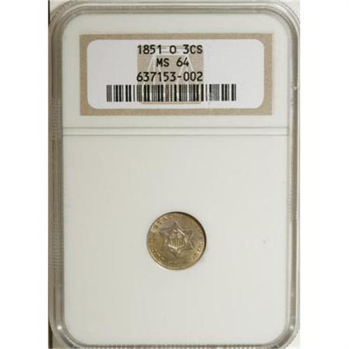 <B>1851-O 3CS MS64 NGC.</B></I> A lovely near-Gem representative of this popular issue, the only trime struck outside Philadelphia. Solidly struck with few marks and soft luster beneath a layer of peach patina.<BR><BR><B>Coin Engraver:</B> James B. Longacre<BR><BR><b>Shipping:</b> Coins & Currency (<a target="_blank" href="http://www.heritageauctions.com/common/shipping.php">view shipping information</a>)