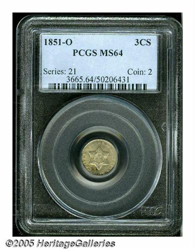 <B>1851-O<3CS> MS64 PCGS.</B></I> Olive, pearl-gray, and russet colors enrich this lustrous and suitably struck near-Gem. The only branch mint issue of the obsolete denomination.
