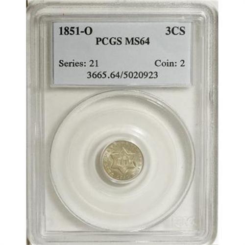 <B>1851-O 3CS MS64 PCGS.</B></I> A satiny, softly struck Choice example of this popular mintmarked trime issue, silver-blue at the margins with a measure of canary-gold in the centers. A planchet flaw appears at the rim near the second T of STATES.<BR><BR><B>Coin Engraver:</B> James B. Longacre<BR><BR><b>Shipping:</b> Coins & Currency (<a target="_blank" href="http://www.heritageauctions.com/common/shipping.php">view shipping information</a>)