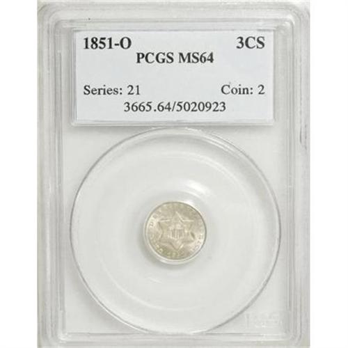 <B>1851-O 3CS MS64 PCGS.</B></I> A satiny, softly struck Choice example of this popular mintmarked trime issue, silver-blue at the margins with a measure of canary-gold in the centers. A planchet flaw appears at the rim near the second T of STATES.<BR><BR><B>Coin Engraver:</B> James B. Longacre<BR><BR><b>Shipping:</b> Coins & Currency (<a target="_blank" href="http://www.heritageauctions.com/common/shipping.php">view shipping information</a>)