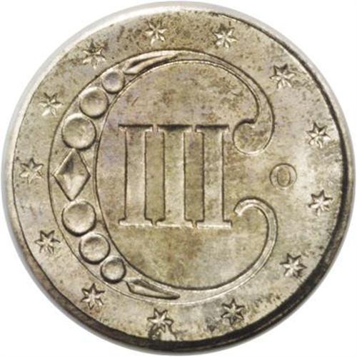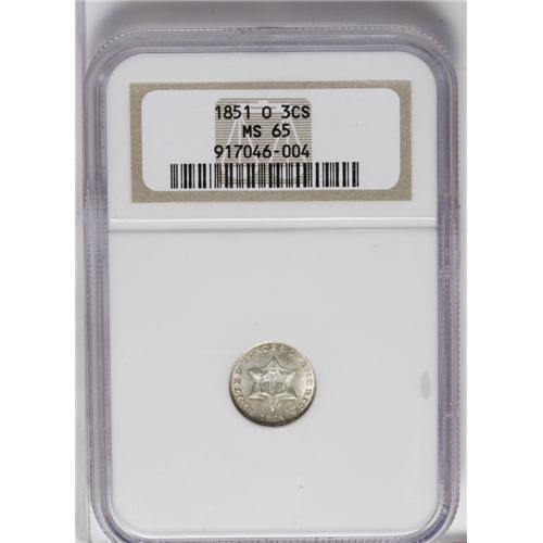 <B>1851-O<3CS> MS65 NGC.</B></I> This was the first and only three cent piece made in New Orleans, and the only branch Mint silver three cent piece produced during the entire history of the denomination from 1851 to 1873. Light gold toning is evident over frosty luster with hints of lilac toning. This is an elusive issue in Mint State grades, and especially difficult to locate in Gem quality. Census: 49 in 65, 14 finer (8/06).