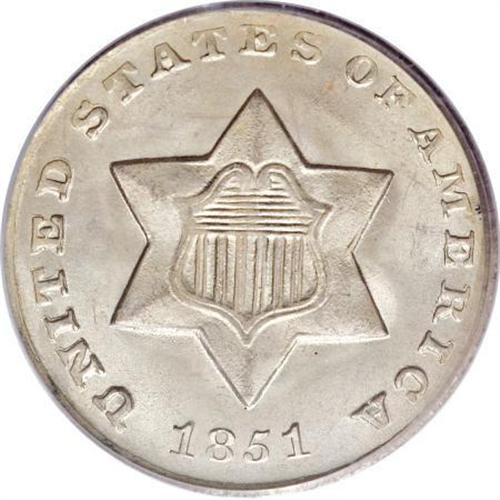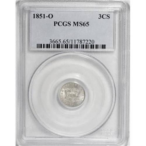 <B>1851-O 3CS MS65 PCGS.</B></I> Glowing luster emanates from both sides of this lovely New Orleans Mint issue. The design elements are much better impressed than often seen on the '51-O trime, and the frosty surfaces are essentially untoned. Close examination reveals no significant marks. Population: 44 in 65, 11 finer (8/07).<BR><BR><B>Coin Engraver:</B> James B. Longacre<BR><BR><b>Shipping:</b> Coins & Currency (<a target="_blank" href="http://www.heritageauctions.com/common/shipping.php">view shipping information</a>)