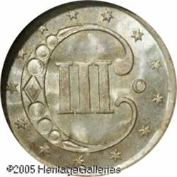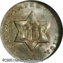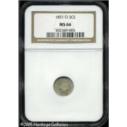 <B>1851-O 3CS MS66 NGC.</B></I> A coin of enduring popularity with collectors, the 1851-O is the only mintmarked Three Cent Silver. The surfaces of this extraordinary coin have dappled, multicolored rose, gold, and blue patination in a very light manner. Its originality is unquestioned, as is this coin's attractive, overall eye appealing nature. Beneath the light layerings of color are glimmers of sparkling mint luster that further enhance the rich tonal qualities. Population: 10 in 66, 2 finer (1/05). Lot:5645