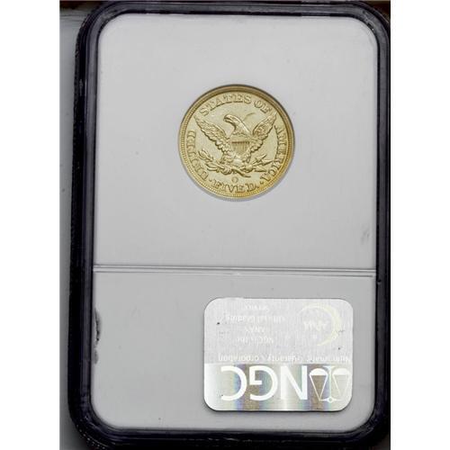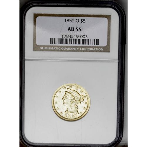 <B>1851-O<$5> AU55 NGC.</B></I> Like the quarter eagle of this date and mint, the 1851-O half eagle is a scarce and curiously overlooked issue. There are approximately 125-150 pieces known in all grades and most of these are in the Very Fine to Extremely Fine grade range. In About Uncirculated, this is a rare coin with just fifteen to twenty pieces known. Mint State 1851-O examples are very rare, as are all O-mint half eagles from the 1850s. The devices show some of the usually found weakness, especially in the center of the reverse, the bright yellow-gold surfaces still retain significant amounts of luster in the fields. Numerous small, medium, and large abrasions are scattered over each side, as is a shallow strike-through above the eagle on the reverse. Census: 11 in 55, 24 finer (6/06).