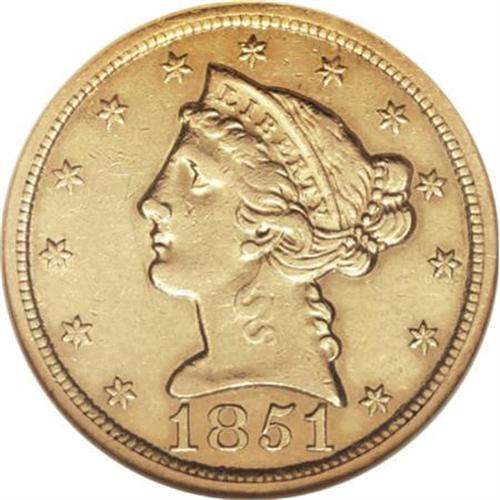 <B>1851-O $5 AU55 NGC.</B></I> This No Motto O-mint five is refreshingly unabraded aside from a faint thin vertical mark near the profile. Liberty's curls and the eagle's neck and fletchings lack a full strike, but peripheral elements such as the stars and dentils are boldly brought up. A mere 41,000 pieces were struck, and unimpaired survivors are scarce. Census: 12 in 55, 24 finer (7/07).<BR><BR><B>Coin Engraver:</B> Christian Gobrecht<BR><BR><b>Shipping:</b> Coins & Currency (<a target="_blank" href="http://www.heritageauctions.com/common/shipping.php">view shipping information</a>)