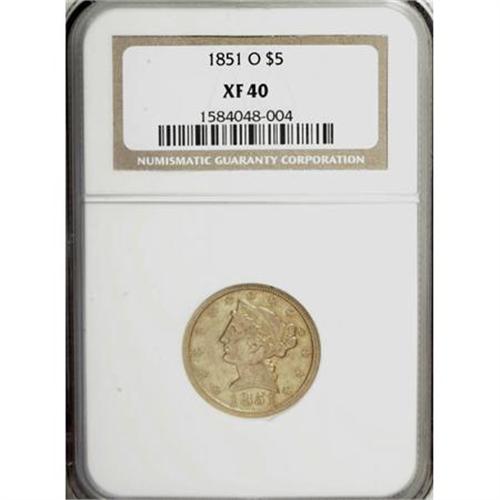 <B>1851-O $5 XF40 NGC.</B></I> Despite light, even wear over the well struck devices, this orange-gold example retains a measure of luster in the fields. The surfaces show only a few distracting marks, and the overall visual appeal is excellent.<BR><BR><B>Coin Engraver:</B> Christian Gobrecht<BR><BR><b>Shipping:</b> Coins & Currency (<a target="_blank" href="http://www.heritageauctions.com/common/shipping.php">view shipping information</a>)