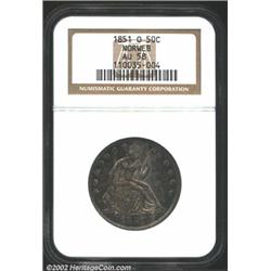 1851-O 50C AU58 NGC. The surfaces have mottled silver-gray and maroon patina. A well struck example that has lustrous devices and a few minor contact marks on the obverse field. The chest of Liberty has tiny planchet flaws that are as struck. Population: 2 in 58, 15 finer (4/02).Ex: Norweb Collection (Bowers and Merena, 11/1988), lot 3155, where it realized $412.50. Important notice: We expect to be auctioning lots at the rate of 200-250 per hour. Sometimes eBay Premier live bid software cannot keep up with that pace, so we strongly recommend that you place a realistic proxy bid now as insurance to avoid disappointment. Also please note that all Heritage/CAA lots purchased through eBay Premier carry a 20% Buyer's Premium. Please make sure you read the Terms and Conditions.