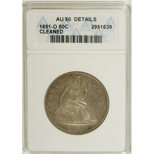 <B>1851-O 50C --Cleaned--ANACS. AU50 Details.</B></I> NGC Census: (0/28). PCGS Population (1/42). Mintage: 402,000. Numismedia Wsl. Price: $233. (#6267)<BR><BR><b>Shipping:</b> Coins & Currency (<a target="_blank" href="http://www.heritageauctions.com/common/shipping.php">view shipping information</a>)