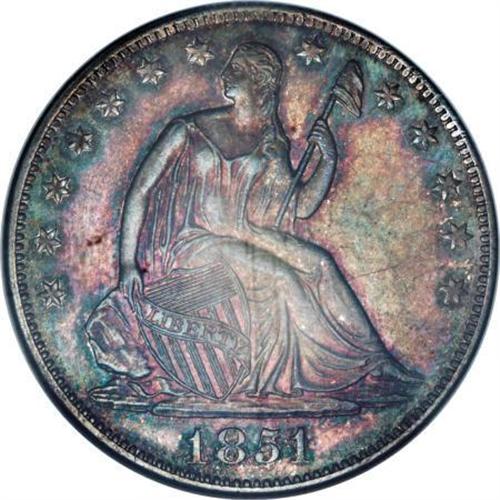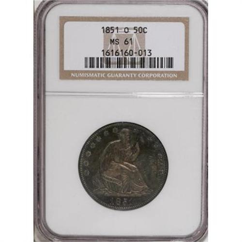 <B>1851-O 50C MS61 NGC.</B></I> A dark blanket of rich mahogany, deep blue, and orange colors covers both sides of this fully Mint State example. The strike is bold and the devices are clean, only the fields are a bit scuffy. This issue is fairly scarce in all grades, especially in XF and above. Census: 3 in 61, 17 finer (11/07).<BR><BR><B>Coin Engraver:</B> Christian Gobrecht<BR><BR><b>Shipping:</b> Coins & Currency (<a target="_blank" href="http://www.heritageauctions.com/common/shipping.php">view shipping information</a>)