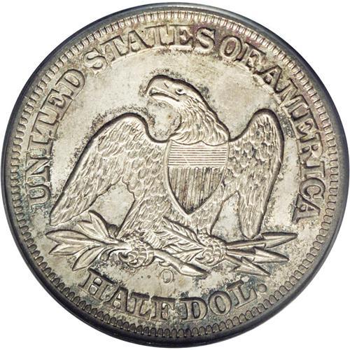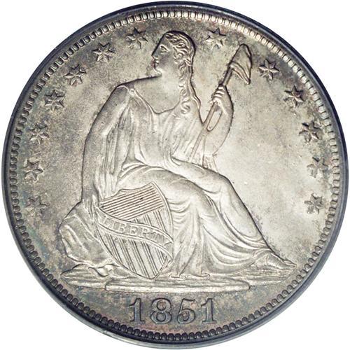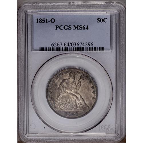 <B>1851-O<50C> MS64 PCGS.</B></I> The 1851-O is fairly scarce in all grades, especially in XF and above. Only about 50 Uncirculated coins have been certified by PCGS and NGC combined. The near-Gem offered here displays lustrous silver-gray surfaces visited by whispers of olive-green, lavender, and electric-blue. A few wispy handling marks are noted in the fields over both sides. The design elements are well brought up throughout. Population: 7 in 64, 3 finer (2/06).