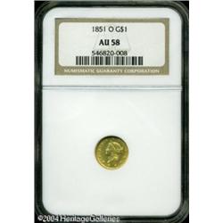 1851-O G$1 AU58 NGC. Luster beckons from protected <B>1851-O G$1 AU58 NGC.</B></I> Luster beckons from protected areas of this unabraded New Orleans Gold Dollar. Only friction on the bust truncation and on the hair below the coronet denies Uncirculated status. <BR><BR><B>Important notice:</B> Heritage usually auctions material at the rate of 200-250 lots per hour. On some occasions eBay Live bid software or the Internet may not be able to keep up with the pace of the auction. We recommend placing a realistic absentee bid now as insurance to avoid disappointment. Occasionally the auctioneer may eliminate or reject an eBay Live bid, and the auctioneer may also reopen a lot after the close of the eBay live bidding (usually because we missed an audience bid), and may reject your bid even if it shows you as the winning bidder. By bidding via eBay Live, you agree that Heritage may award the lot to another bidder at its sole discretion under the circumstances described above or any other reasonable circumstances. Since eBay bids are not shown to us until we open the lot on the floor, we treat those bids just like floor bids. In most cases the floor responds before the eBay bid is presented to us, due to Internet lag time, so for consistency we have made it a policy that floor bids are always considered first over tie eBay live bids. Also please note that all Heritage lots purchased through eBay Live carry a 20% Buyer's Premium. Please make sure you read the Terms and Conditions before you bid. This lot is being auctioned in conjunction with a live floor auction by Heritage Galleries & Auctioneers. All final auction and invoice information will be supplied by Heritage Galleries & Auctioneers, and all other information should be considered preliminary. Lot:6430