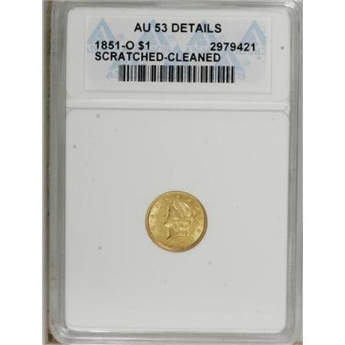 <B>1851-O G$1 --Cleaned, Scratched--ANACS. AU53 Details.</B></I> NGC Census: (18/562). PCGS Population (21/254). Mintage: 290,000. Numismedia Wsl. Price for NGC/PCGS coin in AU53: $250. (#7516)<BR><BR><b>Shipping:</b> Coins & Currency (<a target="_blank" href="http://www.heritageauctions.com/common/shipping.php">view shipping information</a>)