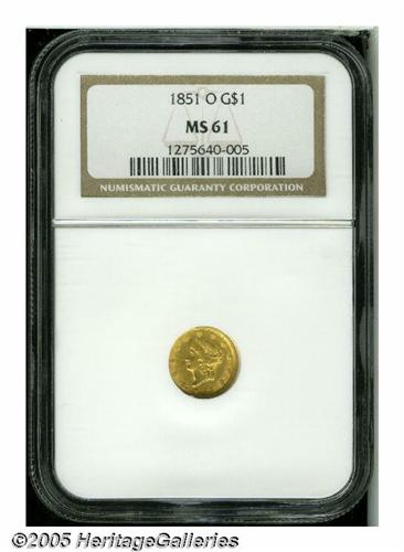 <B>1851-O<G$1> MS61 NGC.</B></I> A pleasing example with frosty luster and attractive light yellow surfaces. The obverse has a faint die crack from the left border to Liberty's eyelid.