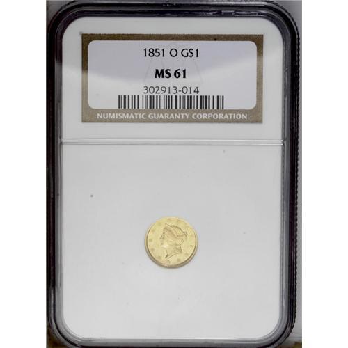 1851-O G$1 MS61 NGC. Typically struck and satiny, with 1851-O[G$1] MS61 NGC.