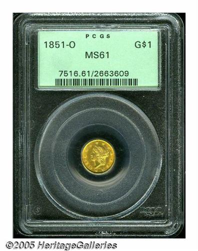 <B>1851-O<G$1> MS61 PCGS.</B></I> This bright lemon-gold Mint State O-mint Dollar has pleasing luster and an exquisite strike. A few short handling marks on the obverse field deny a higher grade. Certified in a green label holder.