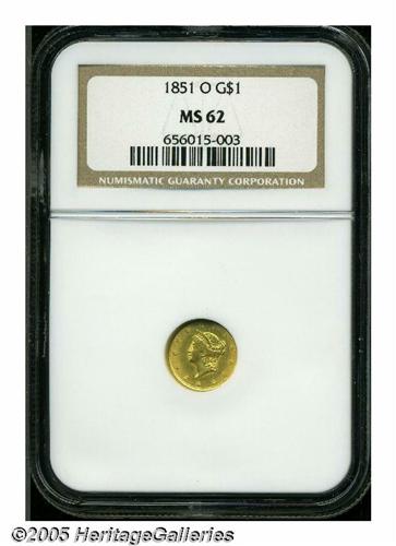 <B>1851-O<G$1> MS62 NGC.</B></I> Boldly struck, save for minor weakness on the second L in DOLLAR, and on the hair detail above Liberty's ear, with bright satin luster, pleasing even green-gold color, and the near-absence of surface marks on either side of the coin.
