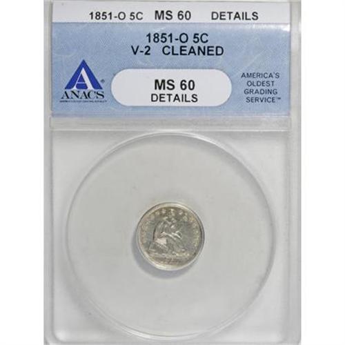 <B>1851-O H10C --Cleaned--ANACS MS60 Details.</B></I> V-2. NGC Census: (0/64). PCGS Population (3/34). Mintage: 860,000. Numismedia Wsl. Price for NGC/PCGS coin in MS60: $260. (#4348)<BR><I>From The Al Blythe Collection of Half Dimes.</B></I><BR><BR><B>Coin Engraver:</B> Christian Gobrecht<BR><BR><b>Shipping:</b> Coins & Currency (<a target="_blank" href="http://www.heritageauctions.com/common/shipping.php">view shipping information</a>)