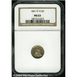 <B>1851-O<H10C> MS63 NGC.</B></I> Nicely struck, with delicate light gold color over lustrous surfaces that reveal some wispy hairlines. Population: 13 in 63, 41 finer (9/04). <BR><BR><B>Important notice:</B> Heritage usually auctions material at the rate of 200-250 lots per hour. On some occasions eBay Live bid software or the Internet may not be able to keep up with the pace of the auction. We recommend placing a realistic absentee bid now as insurance to avoid disappointment. Occasionally the auctioneer may eliminate or reject an eBay Live bid, and the auctioneer may also reopen a lot after the close of the eBay live bidding (usually because we missed an audience bid), and may reject your bid even if it shows you as the winning bidder. By bidding via eBay Live, you agree that Heritage may award the lot to another bidder at its sole discretion under the circumstances described above or any other reasonable circumstances. Since eBay bids are not shown to us until we open the lot on the floor, we treat those bids just like floor bids. In most cases the floor responds before the eBay bid is presented to us, due to Internet lag time, so for consistency we have made it a policy that floor bids are always considered first over tie eBay live bids. Also please note that all Heritage lots purchased through eBay Live carry a 20% Buyer's Premium. Please make sure you read the Terms and Conditions before you bid.