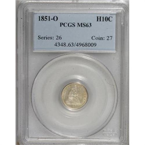 <B>1851-O H10C MS63 PCGS.</B></I> PCGS Population (10/19). NGC Census: (11/36). Mintage: 860,000. Numismedia Wsl. Price for NGC/PCGS coin in MS63: $600. (#4348)<BR><BR><B>Coin Engraver:</B> Christian Gobrecht<BR><BR><b>Shipping:</b> Coins & Currency (<a target="_blank" href="http://www.heritageauctions.com/common/shipping.php">view shipping information</a>)