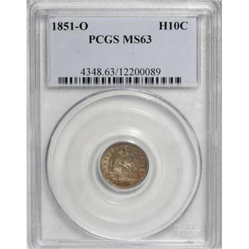 <B>1851-O H10C MS63 PCGS.</B></I> An orange-gold obverse cedes to an essentially untoned reverse. Nicely struck, and just a few minor grade-defining marks. Population: 11 in 63, 19 finer (1/08).<BR><BR><B>Coin Engraver:</B> Christian Gobrecht<BR><BR><b>Shipping:</b> Coins & Currency (<a target="_blank" href="http://www.heritageauctions.com/common/shipping.php">view shipping information</a>)