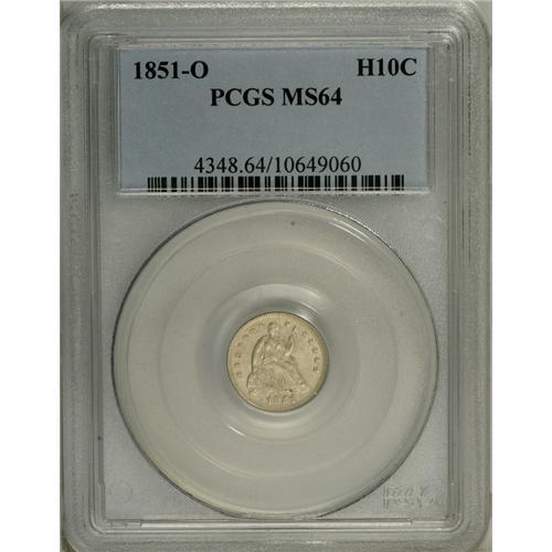 <B>1851-O H10C MS64 PCGS.</B></I> Despite widespread melting during the California Gold Rush era, the 1851-O half dime is available with patience through the MS64 grade level. The strike is strong (though not complete) on the current example and the fields display modest reflectivity. A blanket of creamy beige toning enhances the overall eye appeal of the piece. One of the more available issues from an historically important era rich in numismatic significance. Population: 14 in 64, 4 finer (11/06).<BR><BR><b>Shipping:</b> Coin/Currency (<a target="_blank" href="http://www.heritageauctions.com/common/shipping.php">view shipping information</a>)