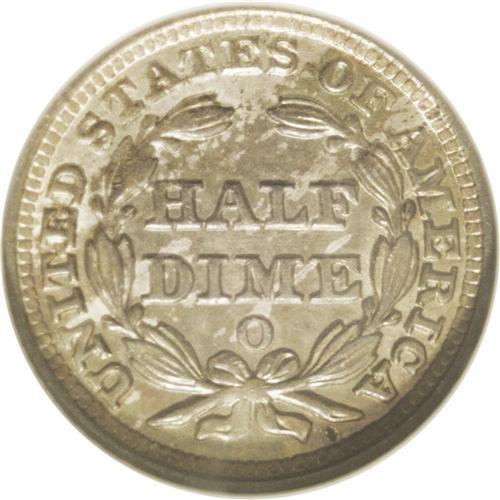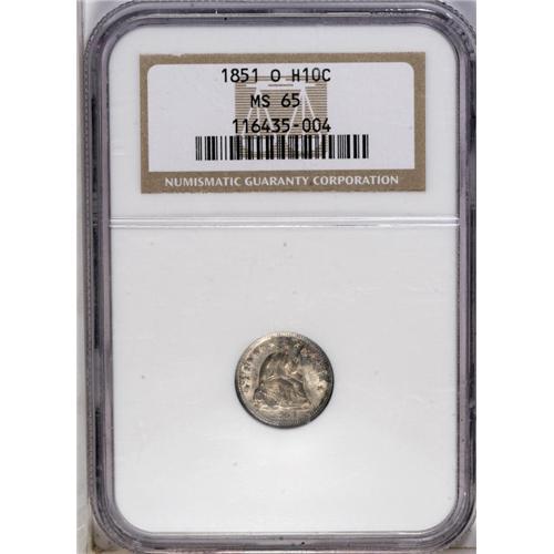 <B>1851-O<H10C> MS65 NGC.</B></I> V-1. Two die pairings served for the New Orleans Mint's emission of 860,000 half dimes in 1851 was achieved with two die marriages. On survivors of V-1, the first 1 in the date is free of Liberty's rock, whereas on examples of V-2 this digit touches the base of the rock. This is the more sharply struck die marriage of the '51-O half dime, but, in true New Orleans Mint fashion, this coin is not fully struck. Still, all major design elements are appreciably bold, and the satiny features reveal modest hints of brightness in the fields. Streaks of olive-gray patina on the reverse, as well as some lavender-gray and blue at the upper right obverse border, interrupt the otherwise steel-gray sheen. When offered at all, the elusive 1851-O is apt to display some degree of wear. This date is undeniably rare as a Gem. Population: 2 in 65, 2 finer (6/06).