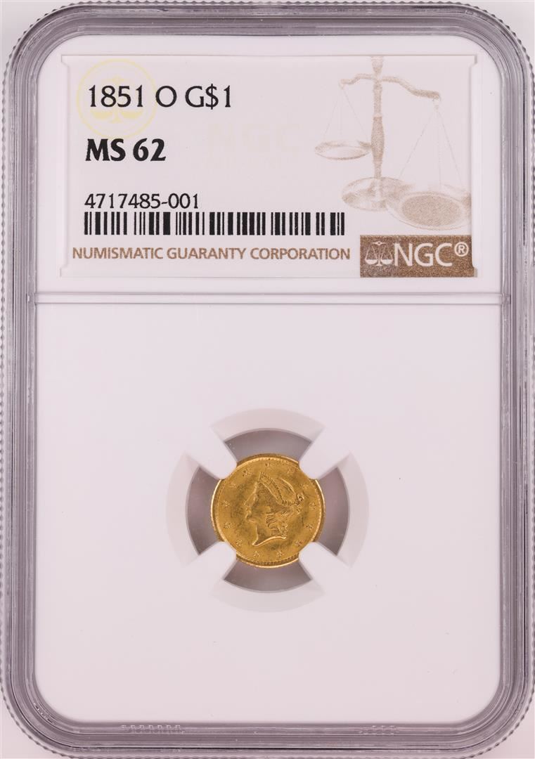 One 1851-O T-1 $1 Gold Dollar Coin NGC MS62.