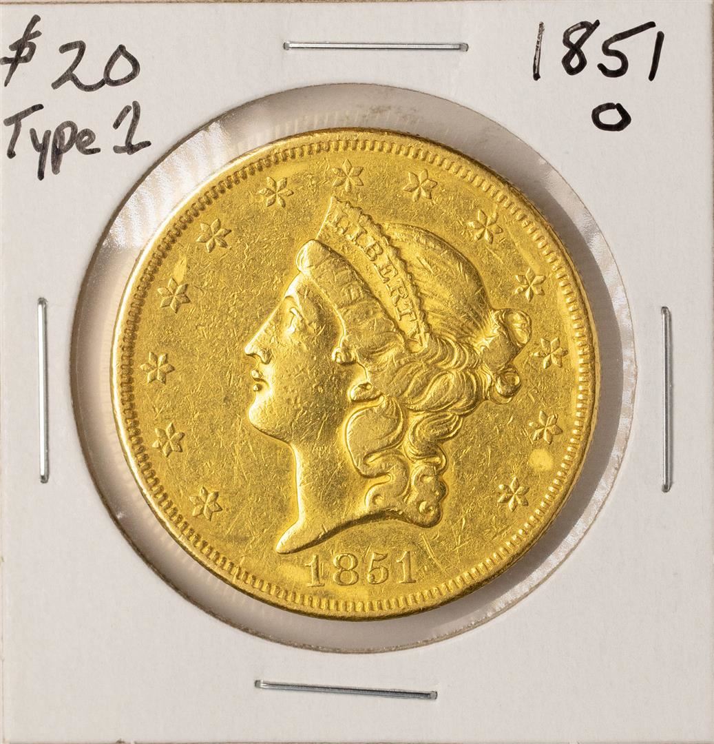 One 1851-O Type 1 $20 Liberty Head Double Eagle Gold Coin.