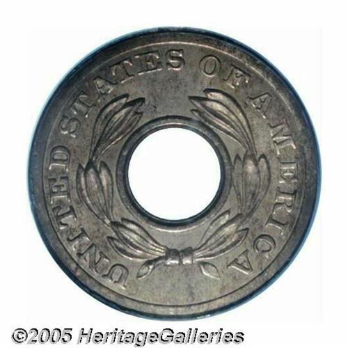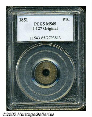 <B>(1851)<P1C> One Cent, Judd-127 Original, Pollock-149, Low R.6, MS65 PCGS.</B></I> An annular pattern that curiously omits the date. The obverse features CENT at the top and ONE TENTH SILVER at the bottom, while the reverse depicts a laurel wreath and the legend UNITED STATES OF AMERICA. Struck in billon (10% silver, 90% copper) with medal turn and a plain edge. This is a pleasing, totally original Gem with a few insignificant carbon flecks on the reverse.<BR><I>From The Western Hills Collection.</B></I>