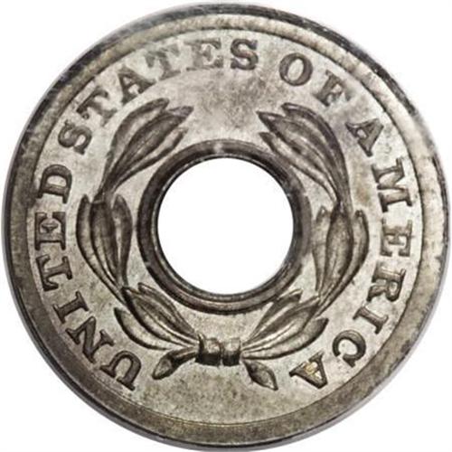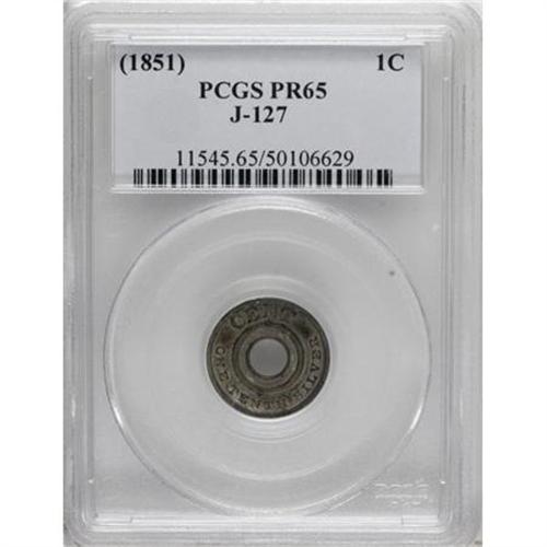 1851 P1C One Cent, Judd-127 Original, Pollock-149, Low R.6, PR65 PCGS. Struck on a perforated annular planchet. The obverse has CENT above and ONE TENTH SILVER below. The reverse shows a wreath of laurel around the second, larger ring with the legend UNITED STATES OF AMERICA outside. Struck in billon with a plain edge. An early attempt at a small cent coin, these pieces were made in response to Congressman Sam F. Vinton of the House Ways and Means Committee's bill that was drafted in 1849. Light gray patina overall with occasional patches of deeper gray.<BR><BR><b>Shipping:</b> Coins & Currency (<a target="_blank" href="http://www.heritageauctions.com/common/shipping.php">view shipping information</a>)