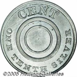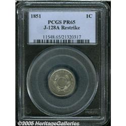 <B>1851 P1C One Cent, Judd-128A Restrike, Pollock-150, R.7, PR65 PCGS.</B></I> This coin is mounted in the PCGS holder backward, and we will use Andrew W. Pollock's definition of the obverse and reverse. The former side displays the denomination CENT above and the composition ONE TENTH SILVER below a non-perforated center. On the reverse, the legend UNITED STATES OF AMERICA surrounds a laurel wreath. Struck in billon (10% silver, 90% copper) with a reeded edge. Less than half a dozen pieces are believed known of this variety today. Light olive-gray tinting overlays both sides of the currently offered example. Distraction-free save for two or three trivial contact marks on each side of the piece, a couple of wispy lintmarks (as struck), and a number of scattered flyspecks. Population: 2 in 65, 0 finer (2/05).
