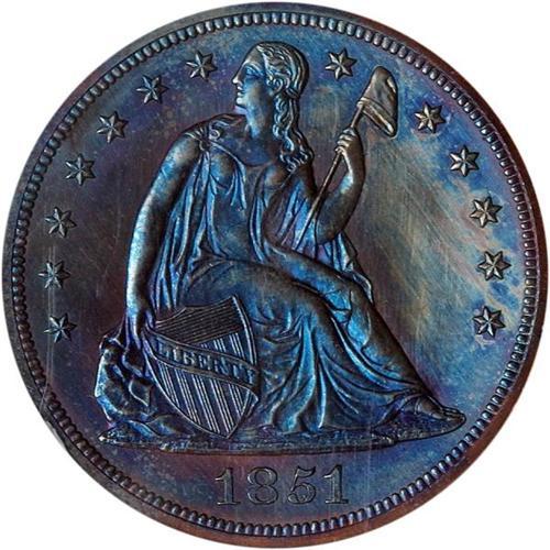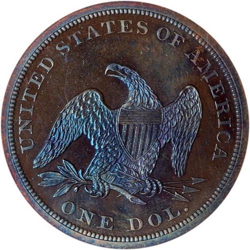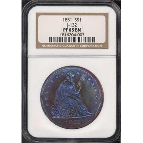 <b>1851 Pattern Silver Dollar. Copper, reeded edge. J-132. NGC graded PF65 BR.</b> NGC serial number 1816204-003. So-called regular die trial for the Seated dollar. Struck in copper with a reeded edge. An incredible value and rarity for the collector of Patterns or, just as desirable, something for the seated Liberty dollar specialist to ponder owning as well. According to the Uspatterns.com website, these pieces were deliberately made for sale to collectors and not really "trials" in the sense usually understood. In early 2001, several articles in Coin World by Quentin David Bowers, a noted scholar, discuss such practices at the mint in those years of providing pieces d'caprice to favored collectors. Donald Taxay, too, has extensive coverage in his U.S. Mint and Coinage book published in the 1970s. Examples are also known in silver and nickel of this rare 1851 seated dollar struck in off-metal. This piece shows incredible striking definition with rich purple brown and blue patina. Everything is pristine, unlike a few recent offerings of "just miss" examples of the J-132 Pattern with their "couple of stray field marks" impairing the surface. No one needs a glass this coin's marvelous state of preservation. The finest known as of April 2006.