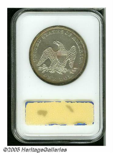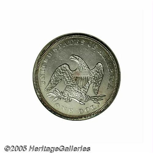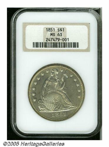 <B>1851<S$1> MS63 NGC.</B></I> The 1851 is a famous rarity within the Seated Liberty series. It is more rare than the 1852, whose mintage of 1,100 pieces is slightly less than the 1851, for which 1,300 coins were struck. The latter production does not count Restrike proofs, which are readily distinguished by the lower placement of the date. Although Original 1851 Dollars have been cataloged as proofs in the past, these are now believed to have been prooflike business strikes. Given the extremely small production, it is not surprising that there are prooflike pieces among the handful of Mint State survivors. Bowers (1993) surmises these prooflike pieces may also have been the outcome of die polishing to remove clash marks. The present piece exhibits a prominent mint-made clash mark beneath the raised arm, yet the unbroken mint luster is mildly mirrored throughout the fields, and even provides slight contrast with the frosty devices. Lightly toned, hints of gold and sea-green color adorn the rims, and wisps of pale rose toning grace the shield and right (facing) wingtip. A small mark beneath the knee and a tiny diagonal tick beneath the first S in STATES are mentioned solely for pedigree purposes. This sharply struck and well pedigreed example deserves placement in the finest specialized set of Seated Dollars. It resides in the same NGC holder from its appearance in the 1993 Worrell auction. In its earlier appearance in the Auction '87 catalog, it was described as "the finest example of this extremely rare date that we have seen or heard of."<BR><I>Ex: Auction '84 (Paramount, 7/84), lot 737, which realized $17,600; Auction '87 (Paramount, 7/87), lot 242, which realized $25,200; Worrell Collection (Superior, 9/93), lot 1314, which realized $26,400; Gainsborough II Sale (Superior, 2/97), lot 1363, which realized $29,700; L.K. Rudolf Collection (Stack's, 5/03), lot 2109, which realized $48,875.</B></I><BR><I>From The Dr. John L. Pellegrini Collection of Liberty Seated Dollars.</B></I>