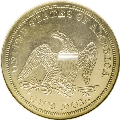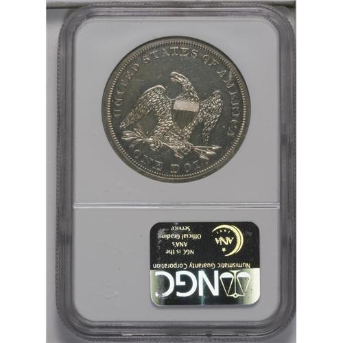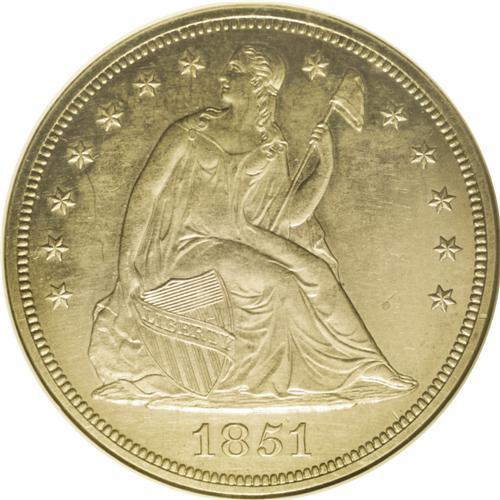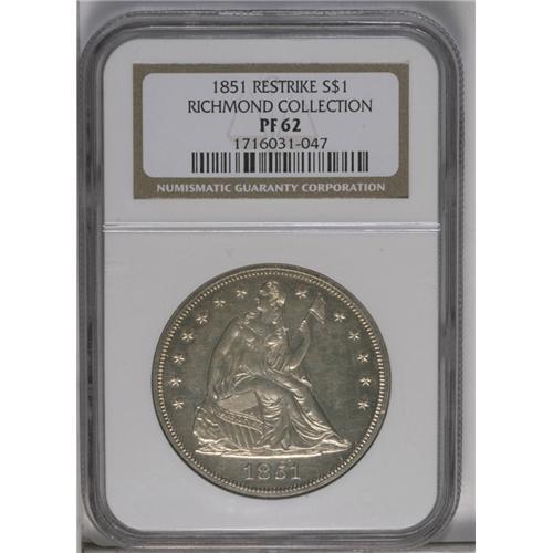 <B>1851<img border='0' src='http://www.heritagecoins.com/images/star.gif' width=10 height=10>$1> Restrike PR62 NGC.</B></I> Ex: Richmond Collection. The 1851 Seated dollar is a confusing date in the series, whose understandability is hampered even more by the infrequency that these pieces were offered. In short, there were 1,300 business strikes produced. That is certain, but after that matters become more cloudy. Allegedly original proofs were struck, but Bowers claims these are really misattributed restrikes or first-strike business strikes. It appears that some 50-100 restrikes were produced in 1858 or later to satisfy collector demand for this date. Much has been made about the centering of the date or its closeness to the rock above the exergual area, but until someone proves definitively that a true, non-die clashed proof with a high date exists, we will assume that the few proofs that are known are all restrikes.<BR> This is a modestly mirrored example that has light, golden-tan toning over each side. A few small contact marks are located in the fields, the most notable are seen to the right of Liberty's shin, another to the left of the eagle's beak, and a third below the left leg of the second A in AMERICA. A lovely example of this very rare and highly sought-after Seated dollar. Census: 5 in 62, 8 finer (6/06).