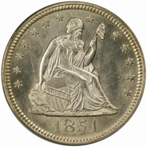 <style type="text/css"> body, td, th { font-family: Arial, Helvetica, sans-serif; font-size: 12px; color: #482424; margin: 0px; padding: 0px; } #header { background-image: url(http://www.bowersandmerena.com/ebay/images/template_v3_01.gif); clear: both; background-color: #590303; border-top-width: 2px; border-top-style: solid; border-top-color: #B38C4F;}#header #header_wrapper { height: 75px; clear: both; width: 800px; margin-right: auto; margin-left: auto; background-image: url(http://www.bowersandmerena.com/ebay/images/template_v3_03.gif); background-repeat: no-repeat; background-position: right; color: #F3EDCC;}#header #header_wrapper #header_logo { float: left; height: 75px; width: 444px; background-image: url(http://www.bowersandmerena.com/ebay/images/template_v3_02.gif); background-repeat: no-repeat; font-size: 10px; text-transform: capitalize; color: #B38C4F;}#header #header_wrapper #header_right { float: left; height: 75px; width: 356px; text-align: right;}#header #header_wrapper #header_right #headerLoginBtn { margin-bottom: 30px;}#header #header_wrapper #header_right input#txtSearch { color: #B49056; border: 1px solid #B49056; width: 175px; padding-top: 3px; padding-right: 3px; padding-bottom: 4px; padding-left: 3px;}#nav { height: 37px; background-image: url(http://www.bowersandmerena.com/ebay/images/template_v3_05.gif); clear: both;}#nav #nav_wrapper { height: 35px; width: 800px; margin-right: auto; margin-left: auto; border-left-width: 1px; border-left-style: solid; border-left-color: #B38C4F;}#nav #nav_wrapper a { padding-right: 15px; padding-left: 15px; border-right-width: 1px; border-right-style: solid; border-right-color: #B38C4F; height: 25px; padding-top: 10px; display: block; float: left; text-decoration: none; font-weight: bold; color: #5D0303;}#nav #nav_wrapper a:hover { color: #B38C4F;}#nav #nav_wrapper #search { float: right; padding-top: 7px;}#nav #nav_wrapper #search #txtSearch { font-family: Arial, Helvetica, sans-serif; font-size: 10px; text-transform: uppercase; color: #D2AE75; border: 1px solid #B38C4F; padding: 3px;}#content_bgd { background-image: url(http://www.bowersandmerena.com/ebay/images/template_v3_09.gif); background-repeat: repeat-y; background-position: center; padding-top: 15px; padding-bottom: 15px; background-color: #FBFBDB;}#content_wrapper { clear: both; height: auto; width: 800px; margin-right: auto; margin-left: auto;}.LotDetailWhite{ line-height:normal; font-size:13px; font-family: arial,helvetica,sans-serif; color: White; font-weight: bold;}.LotDetailInformation{ line-height:normal; font-size: 13px; font-family: arial,helvetica,sans-serif;}.LotDetailMessage{ line-height:normal; font-size: 13px; font-family: arial,helvetica,sans-serif; color: red;}}tr.HeaderAuctionTitle td { color: #000000; font-weight: bold; padding: 2px; background-image: url(http://www.bowersandmerena.com/ebay/images/template_v3_05.gif); background-repeat: repeat-x; border-bottom-width: 1px; border-bottom-style: solid; border-bottom-color: #B38C4F;}table.AuctionSummary a, table.AuctionSummary a:link, table.AuctionSummary a:visited { color: #0000FF; text-decoration: none;}}td.tableHeaderLeft { border-left-width: 1px; border-left-style: solid; border-left-color: #B38C4F;}td.tableHeaderRight { border-right-width: 1px; border-right-style: solid; border-right-color: #B38C4F;}td.tableCellMiddle { border-left-width: 1px; border-left-style: solid; border-left-color: #B38C4F; border-right-width: 1px; border-right-style: solid; border-right-color: #B38C4F; padding: 5px;}tr.footer td { border-top-width: 1px; border-top-style: solid; border-top-color: #B38C4F;}</style></head><body><div id="header"> <div id="header_wrapper"> <div id="header_logo"> </div> <div id="header_right"> </div> </div></div><div id="nav"> <div id="nav_wrapper"> <a href="http://www.bowersandmerena.com">Our eBayLive Auctions</a> <a href="#PaymentInfo">Payment Information</a> <a href="#ShippingInfo">Shipping Information</a> <a href="#About">About Bowers and Merena</a> </div></div><div id="content_bgd"> <div id="content_wrapper"> <table width="100%" border="0" cellpadding="5" cellspacing="0" class="AuctionSummary"> <tbody> <tr class="HeaderAuctionTitle" style="height: 25px;"> <td align="left" class="tableHeaderLeft" > </td> <td align="center" class="tableHeaderRight"> <span style="font-size: large;">Lot #505. 1851 Seated Liberty Quarter. MS-64 (PCGS).</span> </td> </tr> <tr> <td colspan="3" class="tableCellMiddle"> The 1851 is one of the more underrated P-mint issues in the No Motto Seated Quarter series. Survivors in all grades are rarer than even a limited mintage of 160,000 pieces might imply, a fact that suggests widespread melting for this issue during the early-to-mid 1850s. Mint State pieces are particularly elusive, and they merit a Rarity-6 rating in the 1991 book <em>The Comprehensive Encyclopedia of United States Liberty Seated Quarters </em>by Larry Briggs.Here's an important and attractive near-Gem, the surfaces fully untoned and bursting with radiant, satin-textured luster. Overall sharply struck, with only a few trivial, well-scattered abrasions to preclude an even higher Mint State grade. A strong candidate for inclusion in a better-date type set or an advanced collection of Seated Quarters.