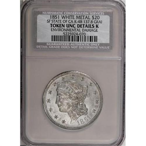 <B>1851 State of California 20 Dollar Token--Environmental Damage NCS. Unc Details.</B></I> Kagin-4B. 137.8 grains. Sometimes called a territorial pattern, these associated pattern issues are highly desirable by advanced specialists, and they rarely appear for sale. A full Mint State example, but lightly corroded as they so often are. Bright gray surfaces and sharp details are present on both sides.<BR><BR><b>Shipping:</b> Coins & Currency (<a target="_blank" href="http://www.heritageauctions.com/common/shipping.php">view shipping information</a>)