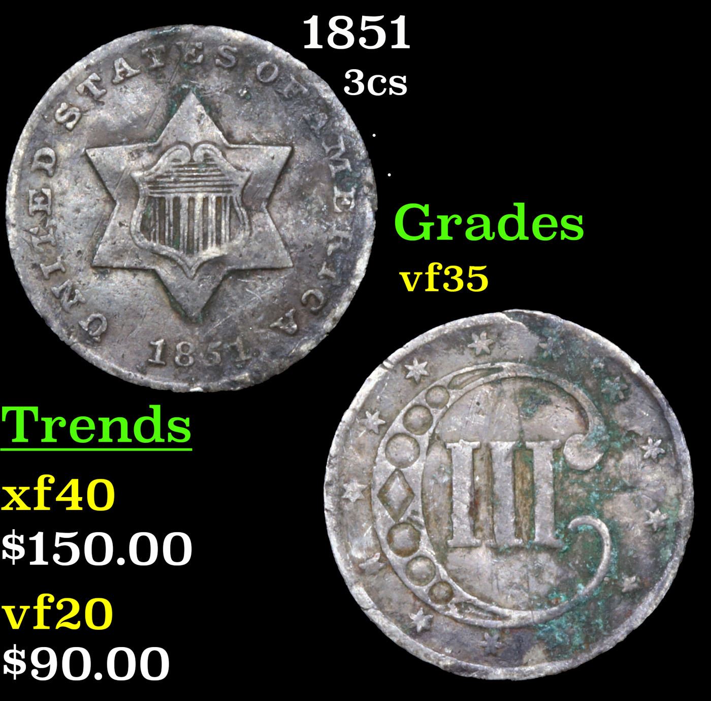 1851 Three Cent Silver 3cs Grades vf++.